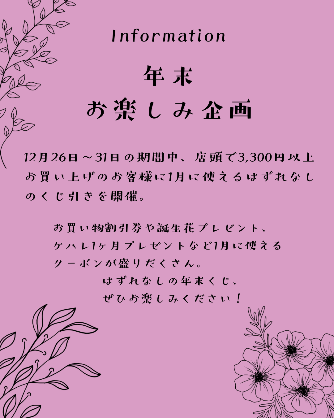12月26日から31日までの期間中、店頭で3300円以上お買い上げのお客様に1月に使えるはずれ無しのくじ引きを開催致します。